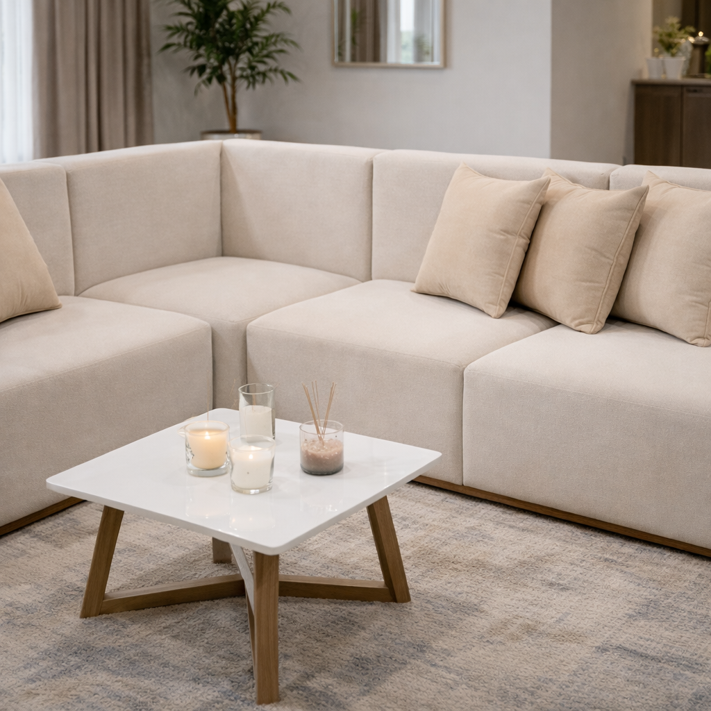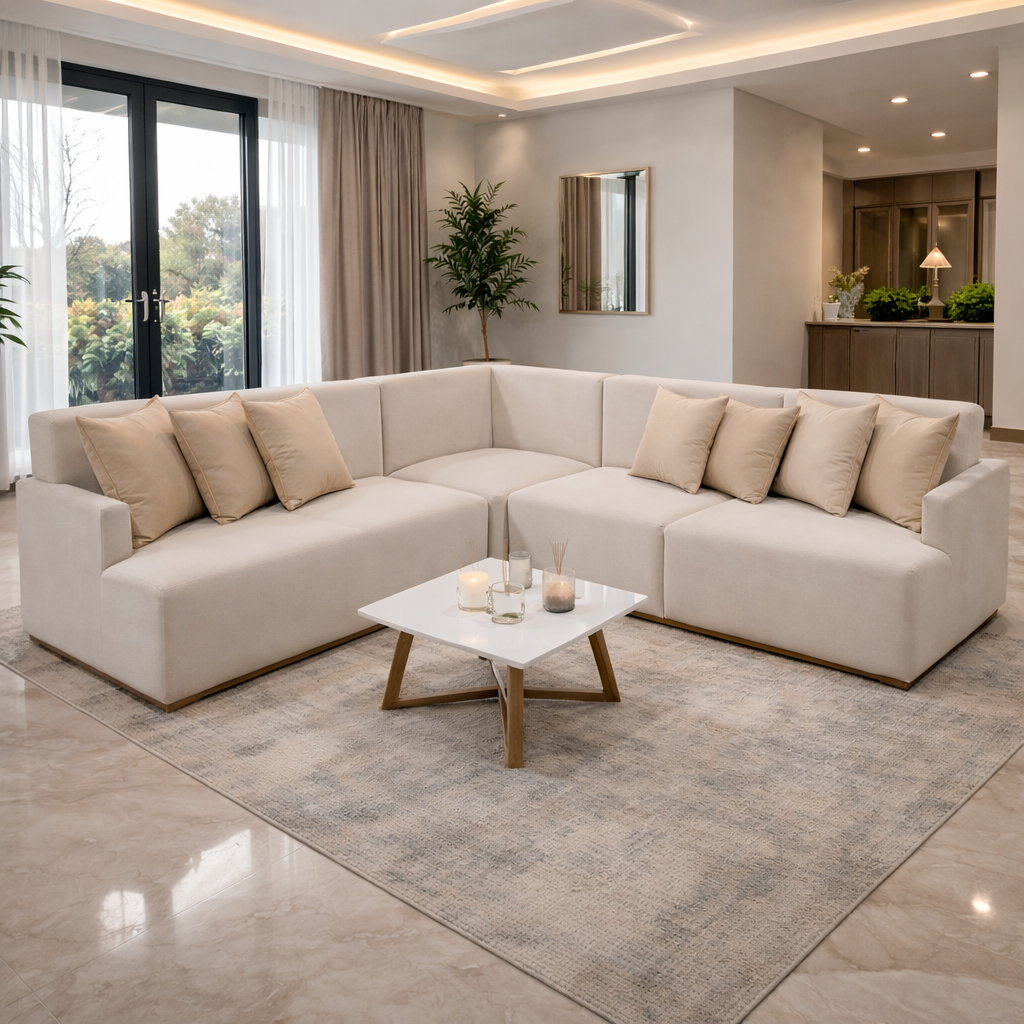 Sala moderna en L con diseño elegante y minimalista, ideal para hogares que buscan comodidad, estilo y exclusividad.